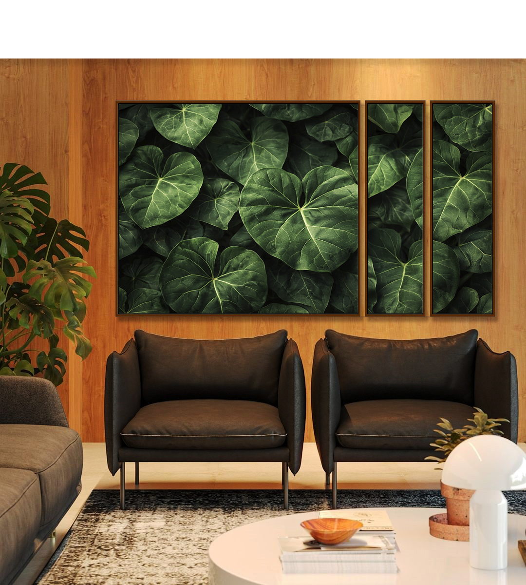 Trio de Quadros Estilizados Verde de Planta Antúrio Tropical Natureza Canvas Moldura