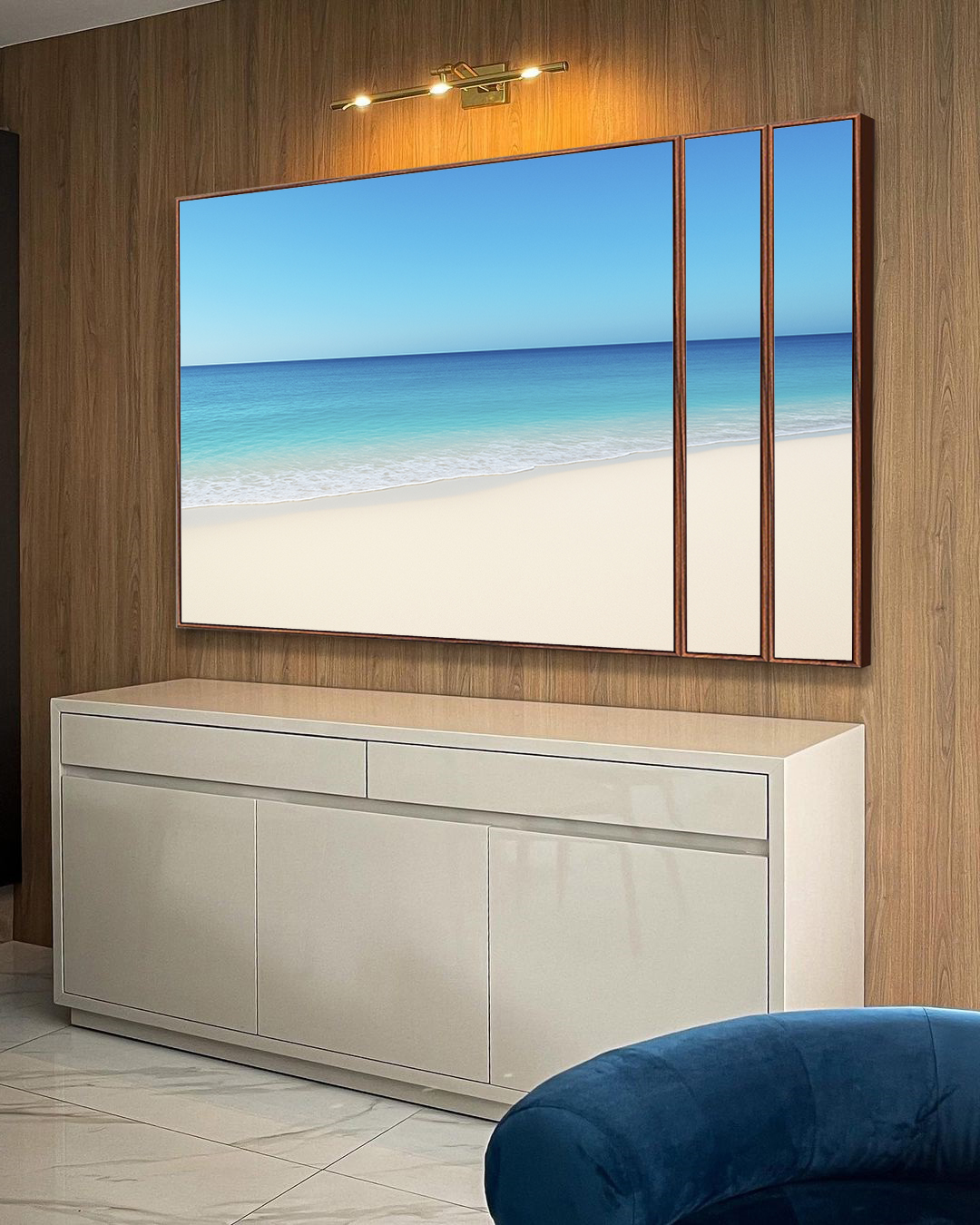 Com tons suaves de azul e a serenidade do mar calmo, este Trio de Quadros Estilizados transmite paz e leveza à decoração.