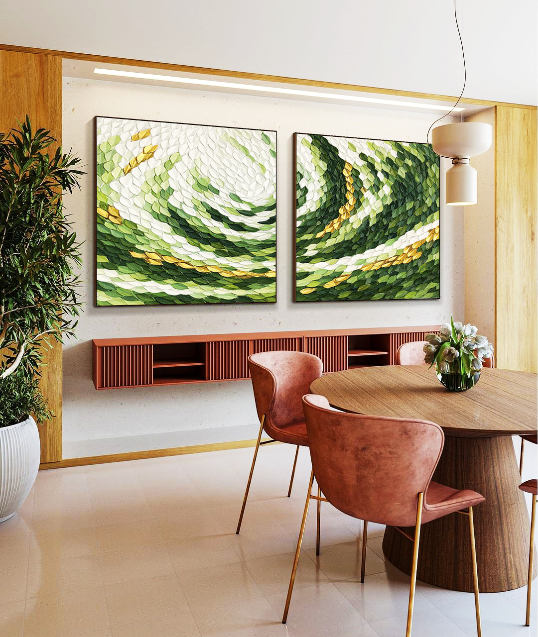 Abstrato em verde e dourado com textura orgânica e efeito dinâmico que cria profundidade e destaque. Perfeito para decoração contemporânea, minimalista ou elegante. Indicado para sala, quarto, consultório ou ambiente profissional.