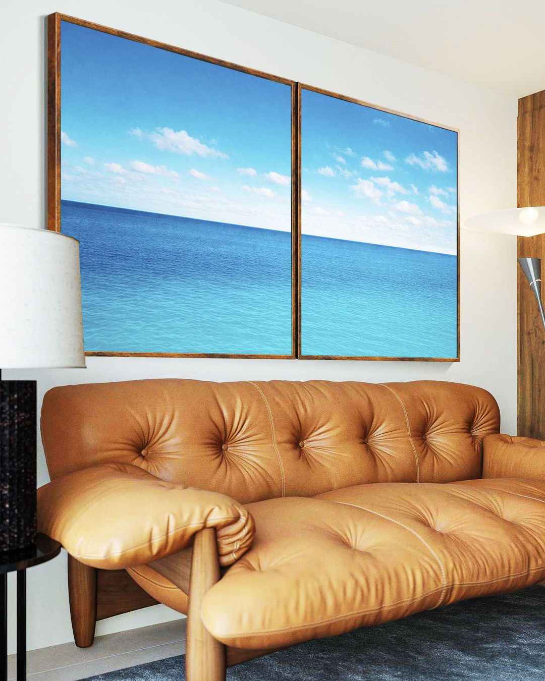 Sereno e sofisticado, este Duo de Quadros com mar calmo azul e céu claro com nuvens transmite frescor e profundidade visual, criando atmosfera de paz. Ideal para decorar salas elegantes, quartos refinados ou escritórios modernos.