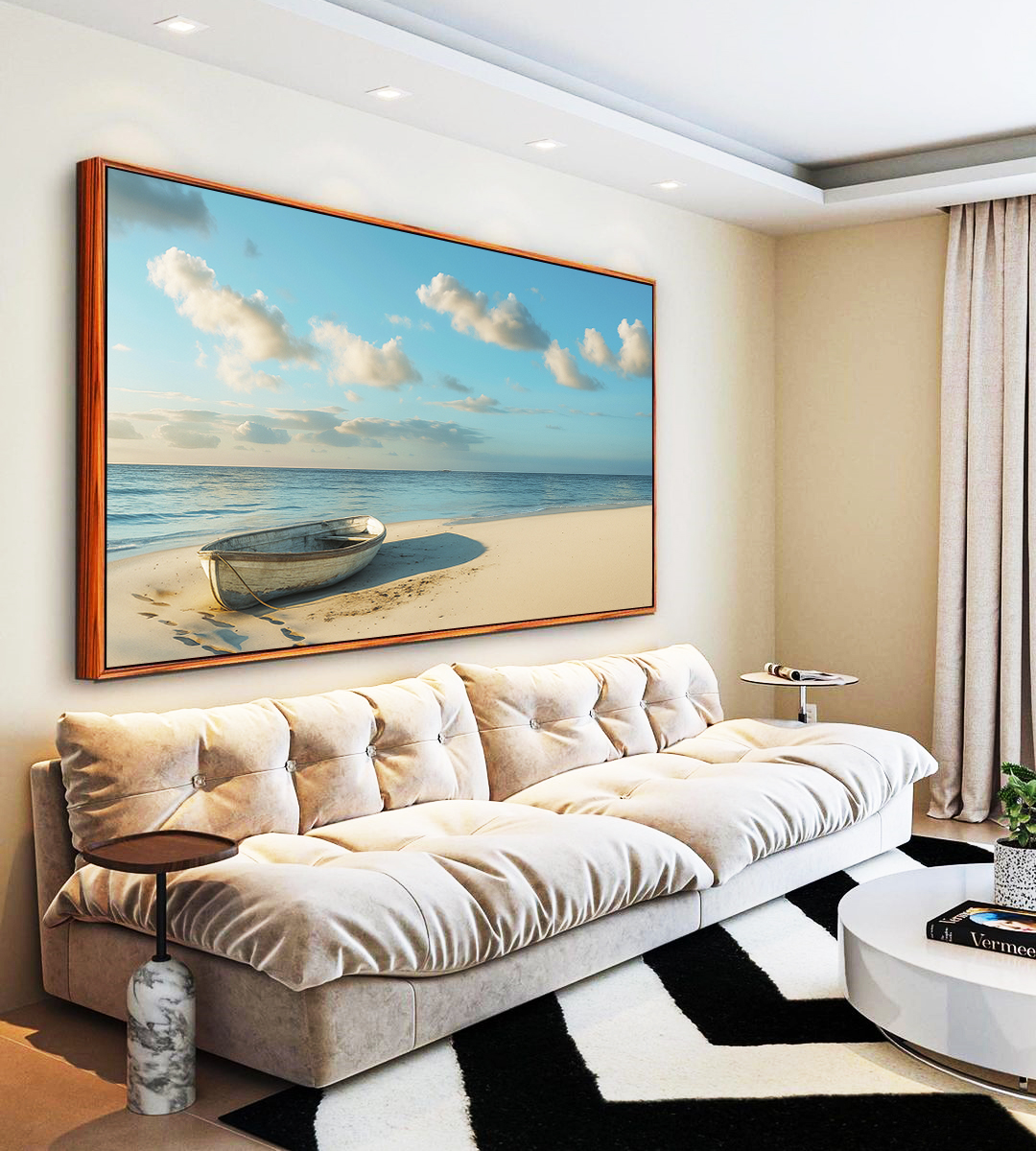 Um Quadro Horizontal encantador que retrata um barco em mar calmo, envolto por nuvens claras delicadas. A escolha certa para quem deseja um ambiente acolhedor e elegante, ideal para salas de estar, quartos e escritórios modernos.
