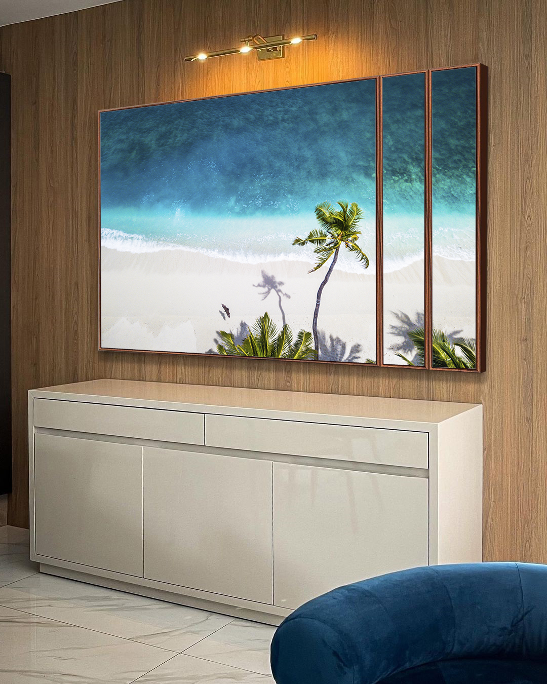 Este Trio de Quadros Estilizados, com mar azul intenso e coqueiro sobre areia branca, inspira paz e frescor. Ideal para decorar salas, quartos ou halls de entrada, criando um ambiente sereno e refinado. Perfeito para quem busca equilíbrio e estilo.