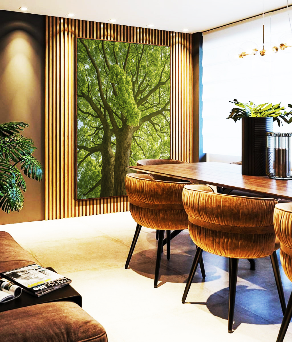 A paisagem natural com árvores e tons de verde traz sensação de calma e harmonia ao espaço. Este Quadro Vertical é a escolha certa para salas de estar, quartos ou escritórios, valorizando a decoração com elegância e bem-estar.
