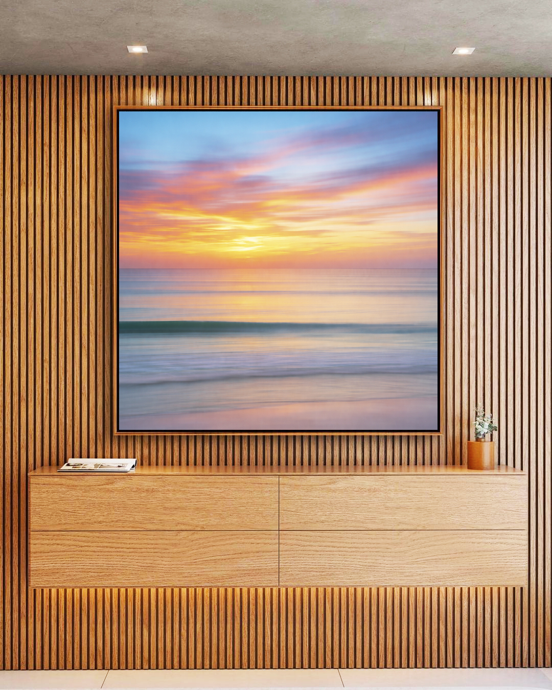 O mar em tons prateados encontra o céu em nuances de laranja e azul, criando uma atmosfera fluida e envolvente. Ideal para salas, quartos e ambientes que buscam leveza, movimento e bem-estar.