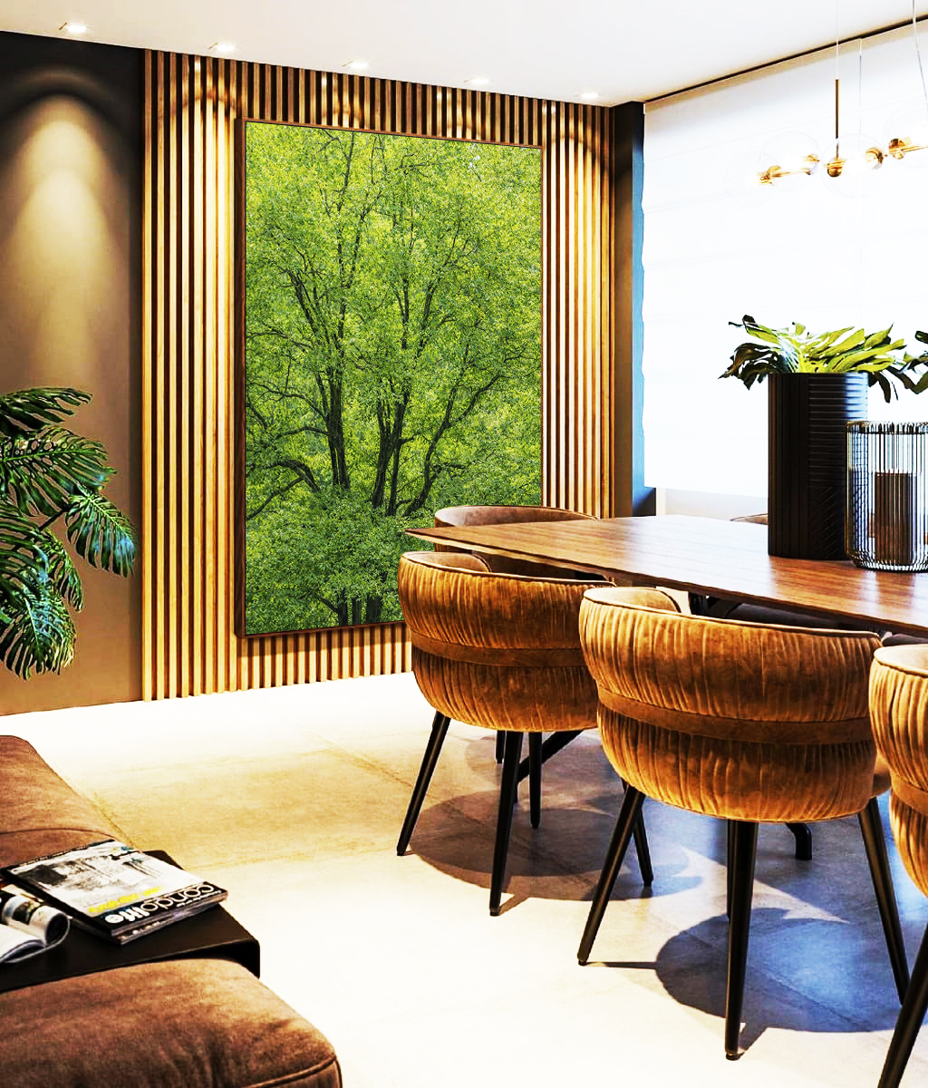 Árvores com folhagem verde intensa formam uma cena natural cheia de vida e harmonia. O Quadro Vertical é ideal para decorar salas de estar, escritórios refinados ou quartos, valorizando o espaço com arte natural e atmosfera acolhedora.
