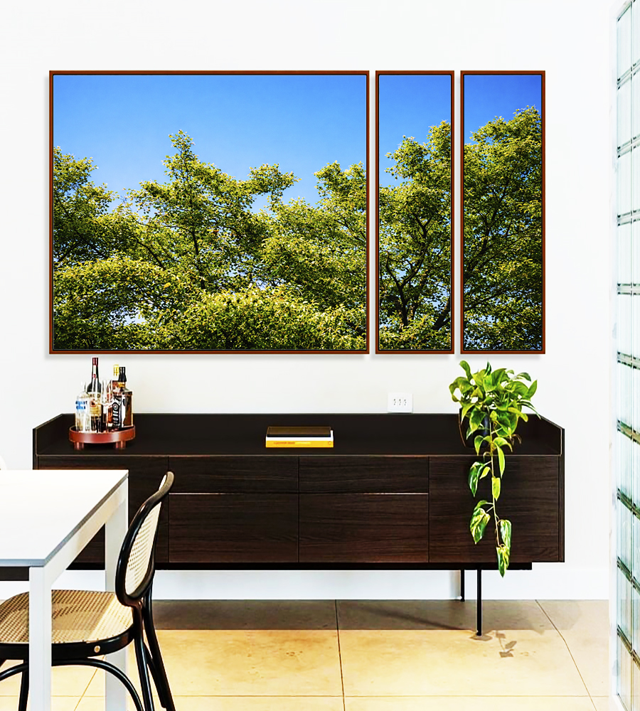 Paisagem de árvores com folhas verdes e céu claro limpo transmite serenidade, natureza e leveza. Estética natural muito usada na decoração contemporânea, criando ambiente acolhedor e equilibrado. Excelente escolha para salas e quartos.