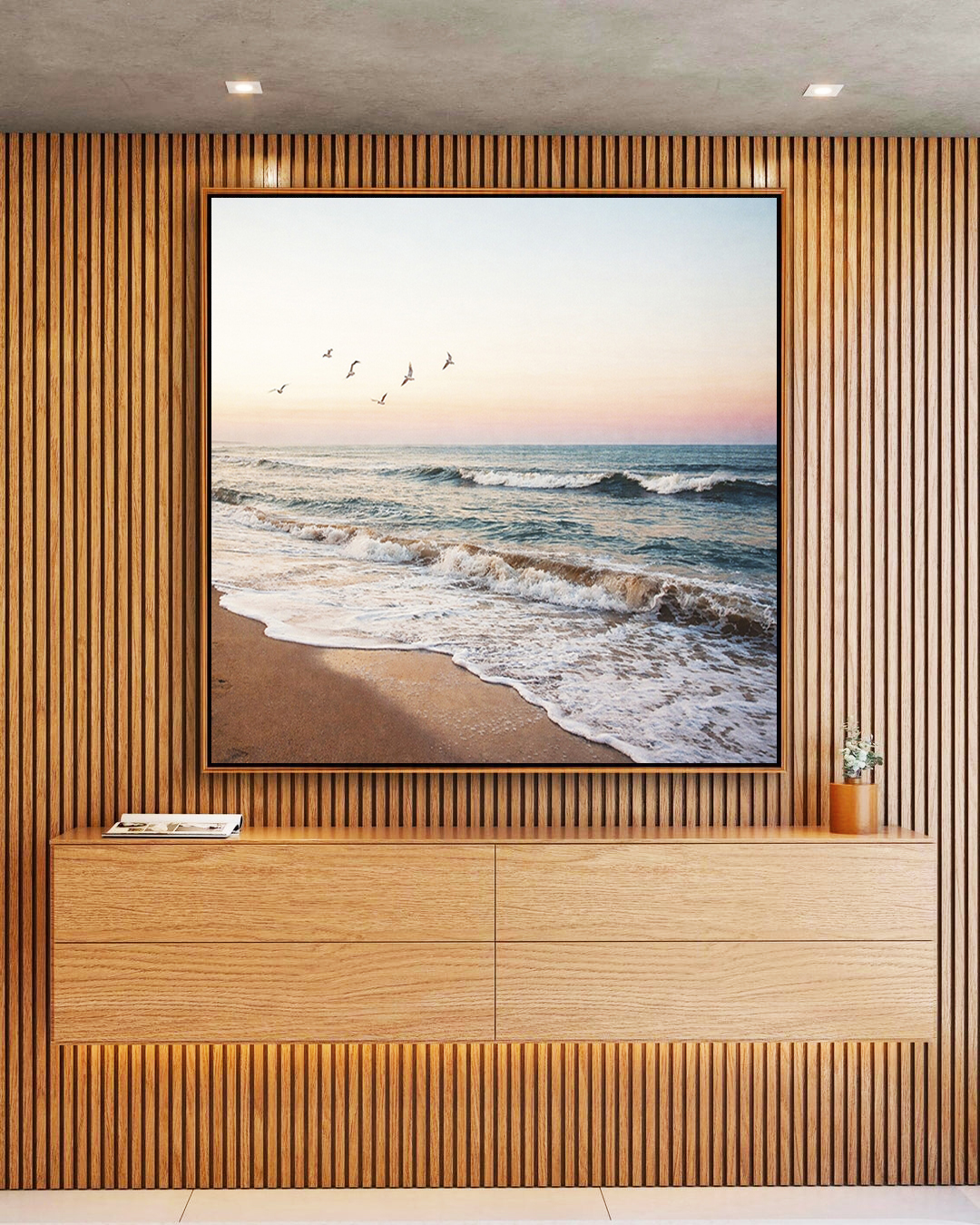 O encontro do mar com o céu claro alaranjado e pássaros em movimento cria uma cena acolhedora e inspiradora. O Quadro Quadrado é ideal para decorar salas de estar, escritórios ou quartos, trazendo tranquilidade e sensação de horizonte aberto.