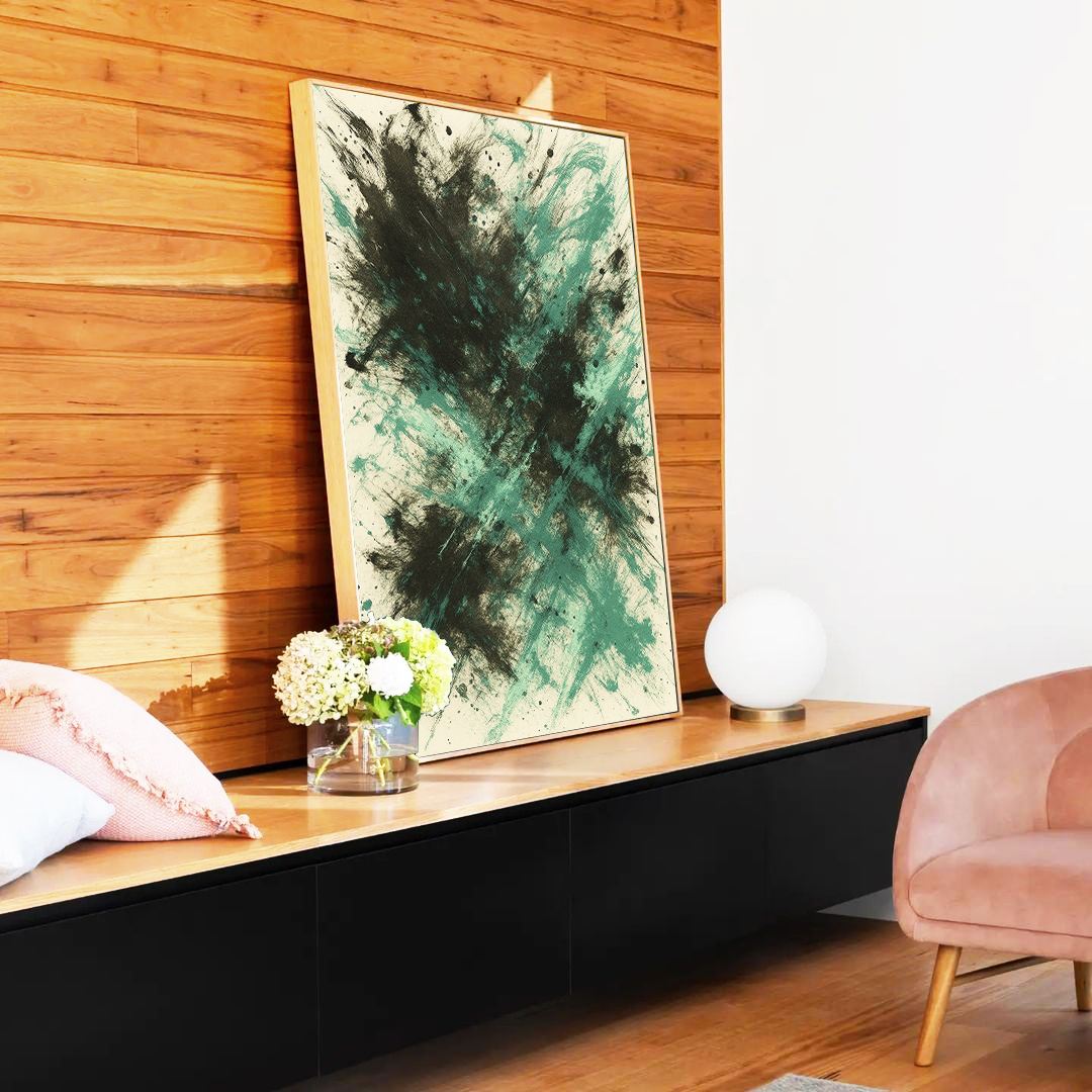 Destaque sua decoração com este Quadro Vertical abstrato em verde menta e cinza chumbo. A moldura moderna dá sofisticação à arte. Perfeito para sala de estar, quarto aconchegante, escritório elegante ou hall de entrada contemporâneo.