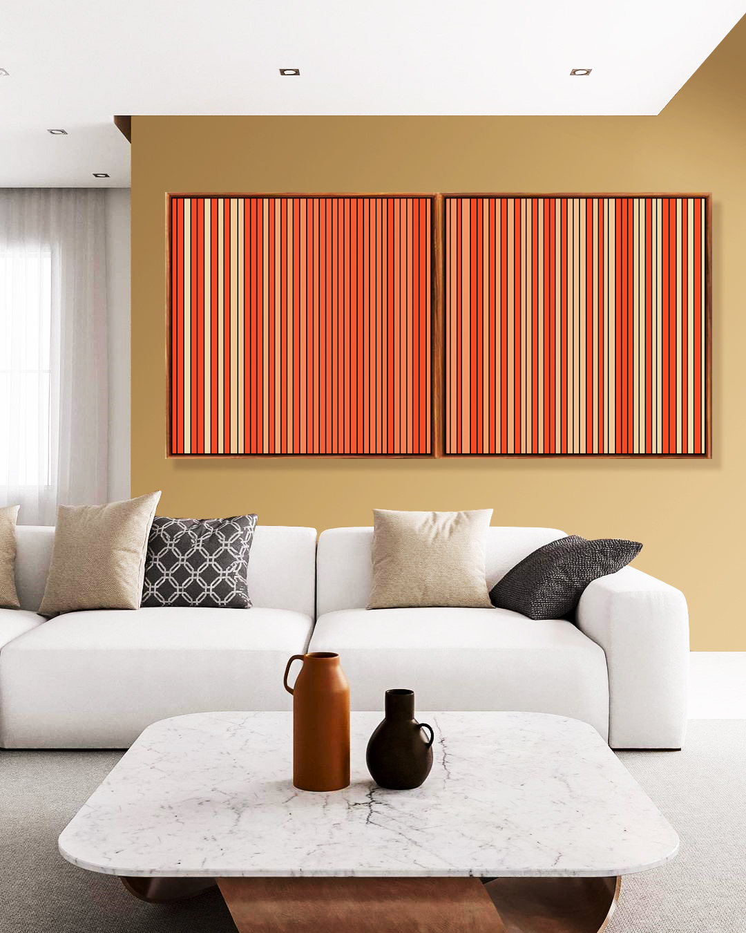 Transforme seu espaço com este Duo de Quadros Quadrados Abstrato degradê em listras laranja, coral e marfim. A escolha ideal para decorar sua Sala, Quarto ou Hall de entrada com estilo moderno, cor vibrante e sofisticação única. Moldura Flutuante Moderna.
