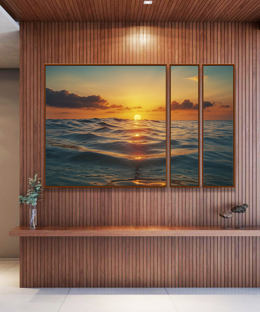 Inspirador e sofisticado, este Trio de Quadros Estilizados combina o brilho do pôr do sol dourado com a tranquilidade do mar azul calmo. A escolha certa para salas modernas, quartos elegantes, escritórios profissionais.