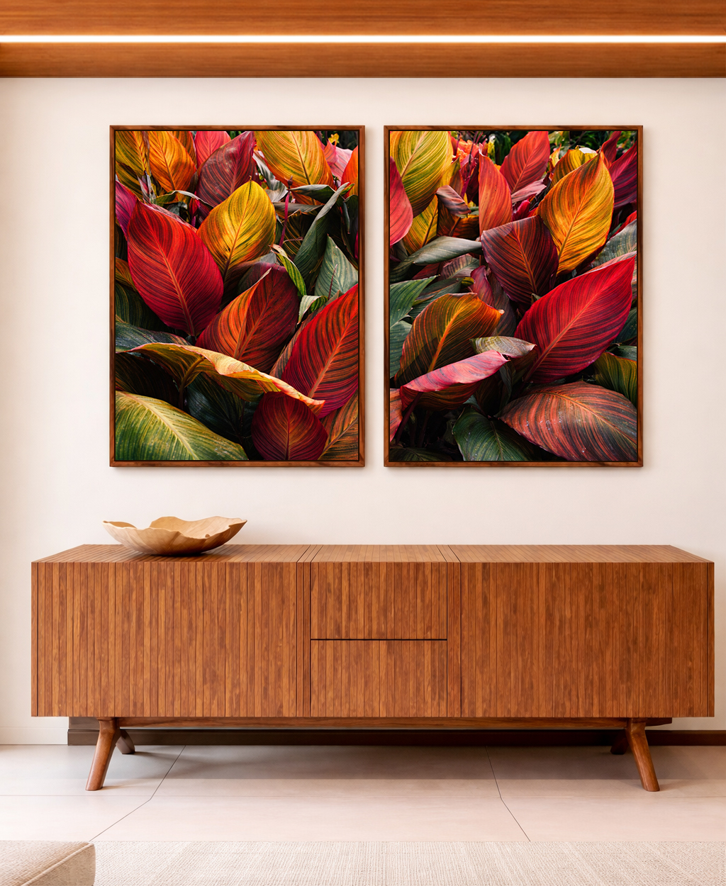 Duo de Quadros Folhagem Tropical Cróton Planta Colorida Natureza Paisagem Canvas Moldura