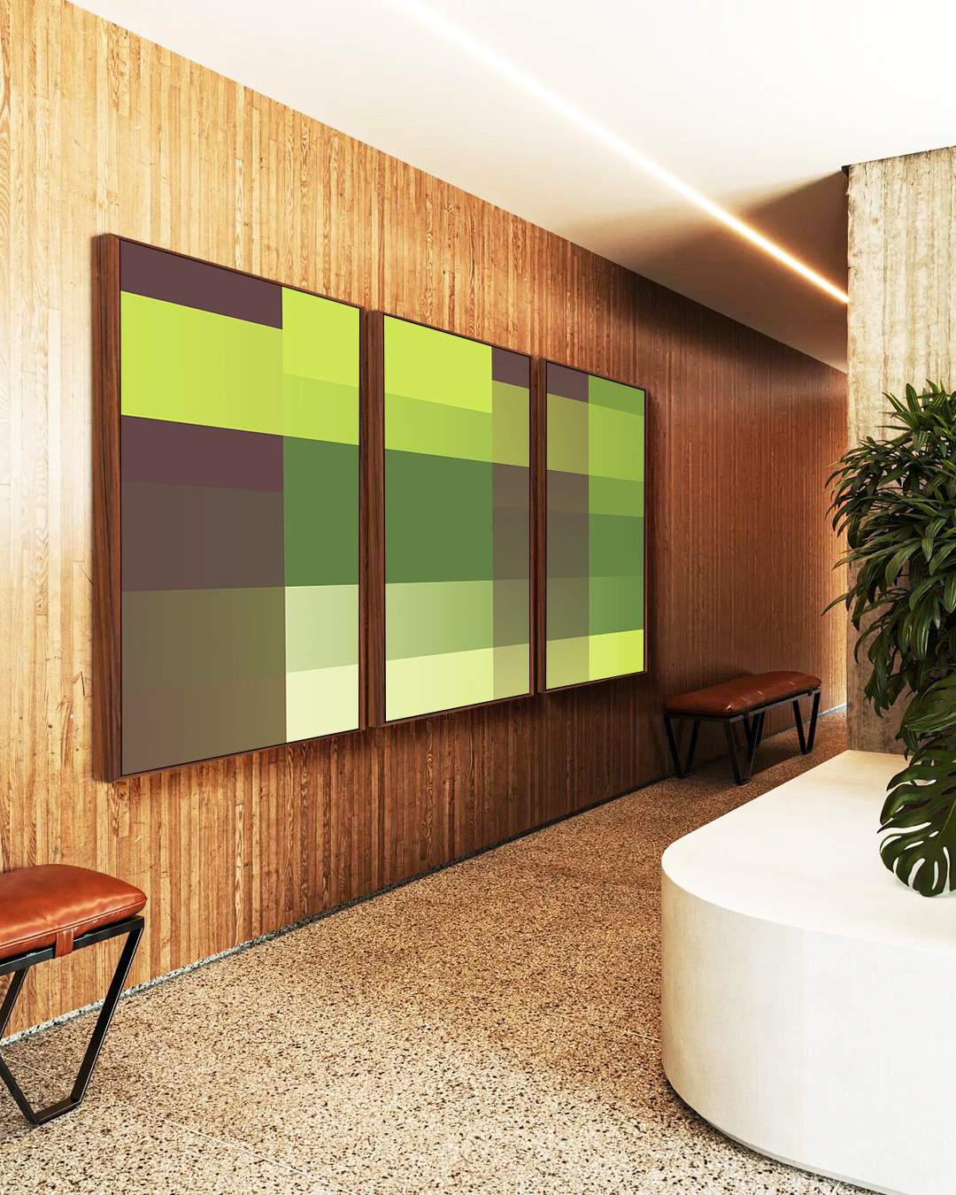 Este Trio de Quadros combina nuances de verde e marrom em um degradê mosaico encantador, criando um efeito visual marcante. Perfeito para decorar salas, escritórios ou quartos com um toque contemporâneo e acolhedor.