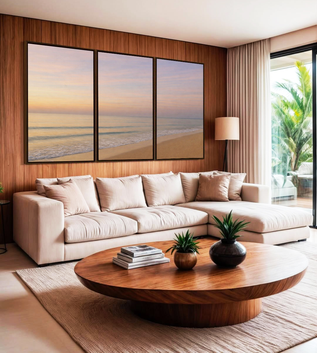 Sereno e encantador, este Trio de Quadros com nascer do sol lilás sobre praia serena e mar azul prateado cria atmosfera leve e sofisticada. A escolha ideal para salas elegantes, quartos tranquilos, ou escritórios modernos.