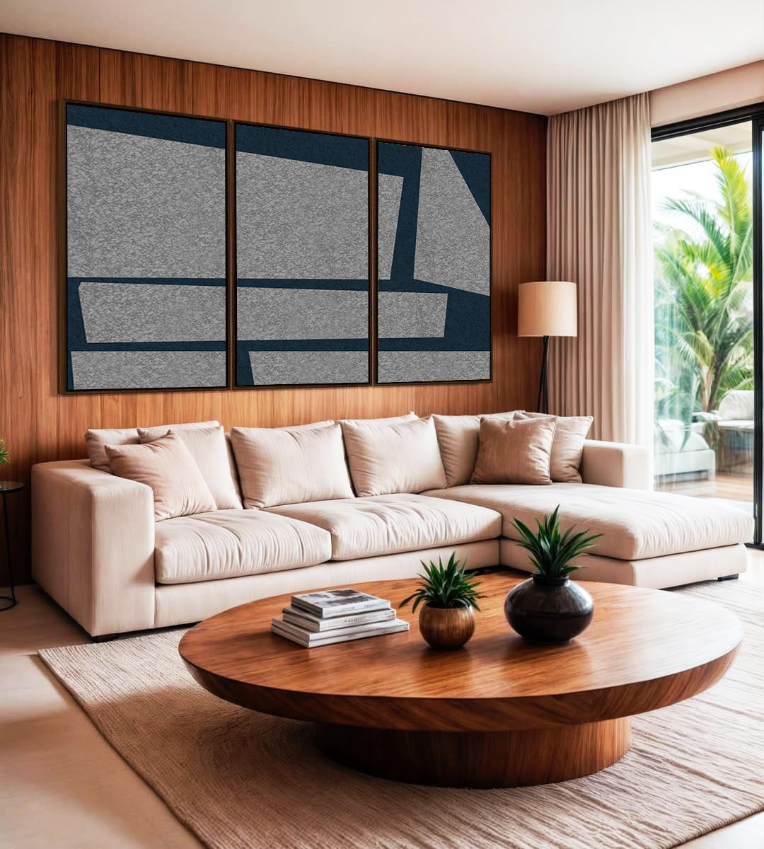 Com tons de cinza e azul em perfeita harmonia, este Trio de Quadros traz equilíbrio e serenidade ao ambiente. A escolha ideal para decorar salas, escritórios ou halls de entrada com arte minimalista e design contemporâneo.
