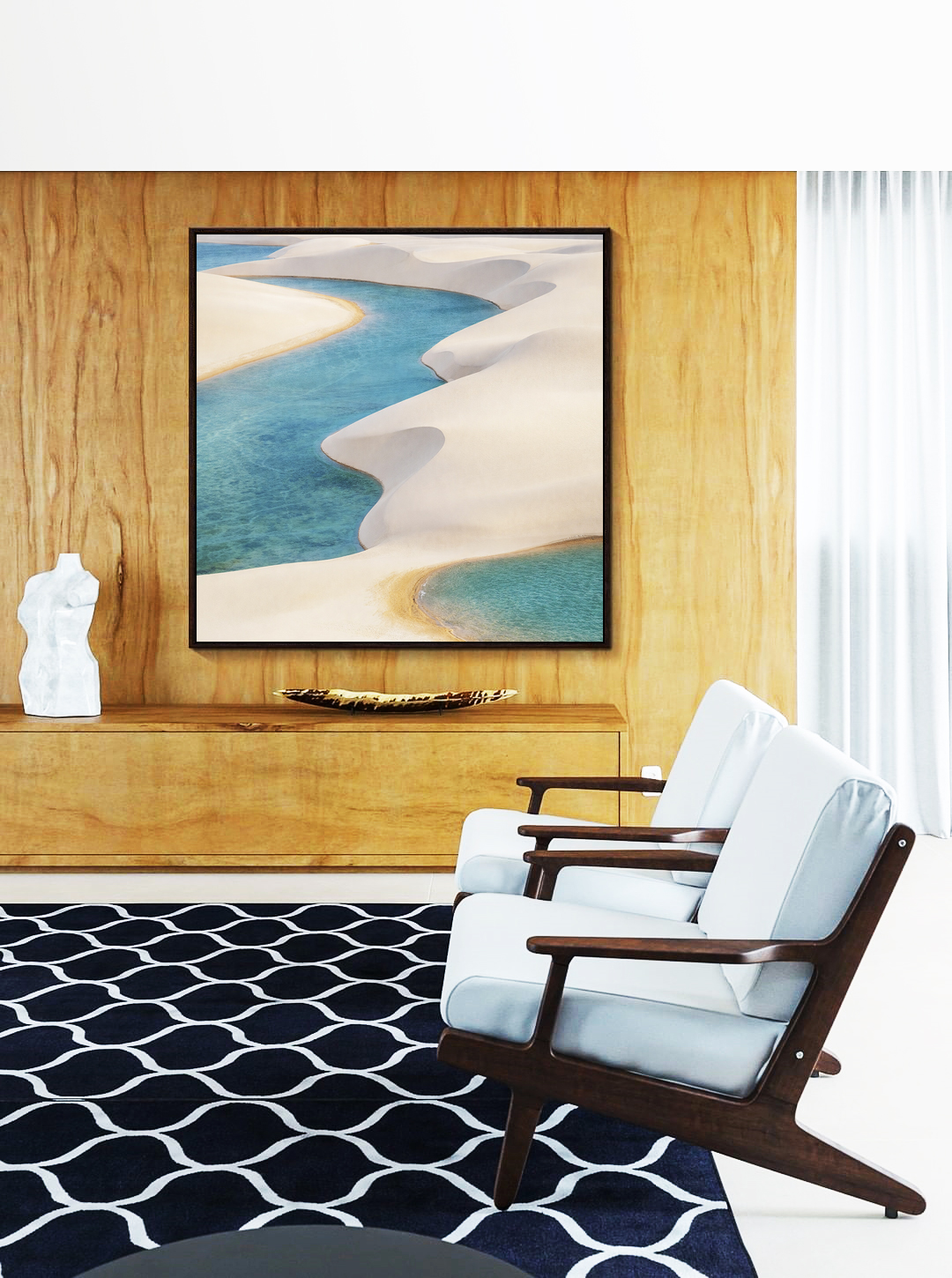 Dunas de areia branca e mar azul claro que trazem leveza e tranquilidade ao ambiente. Perfeito para sala, quarto ou espaços de descanso com uma sensação fresca e natural. Leve e Encantador!