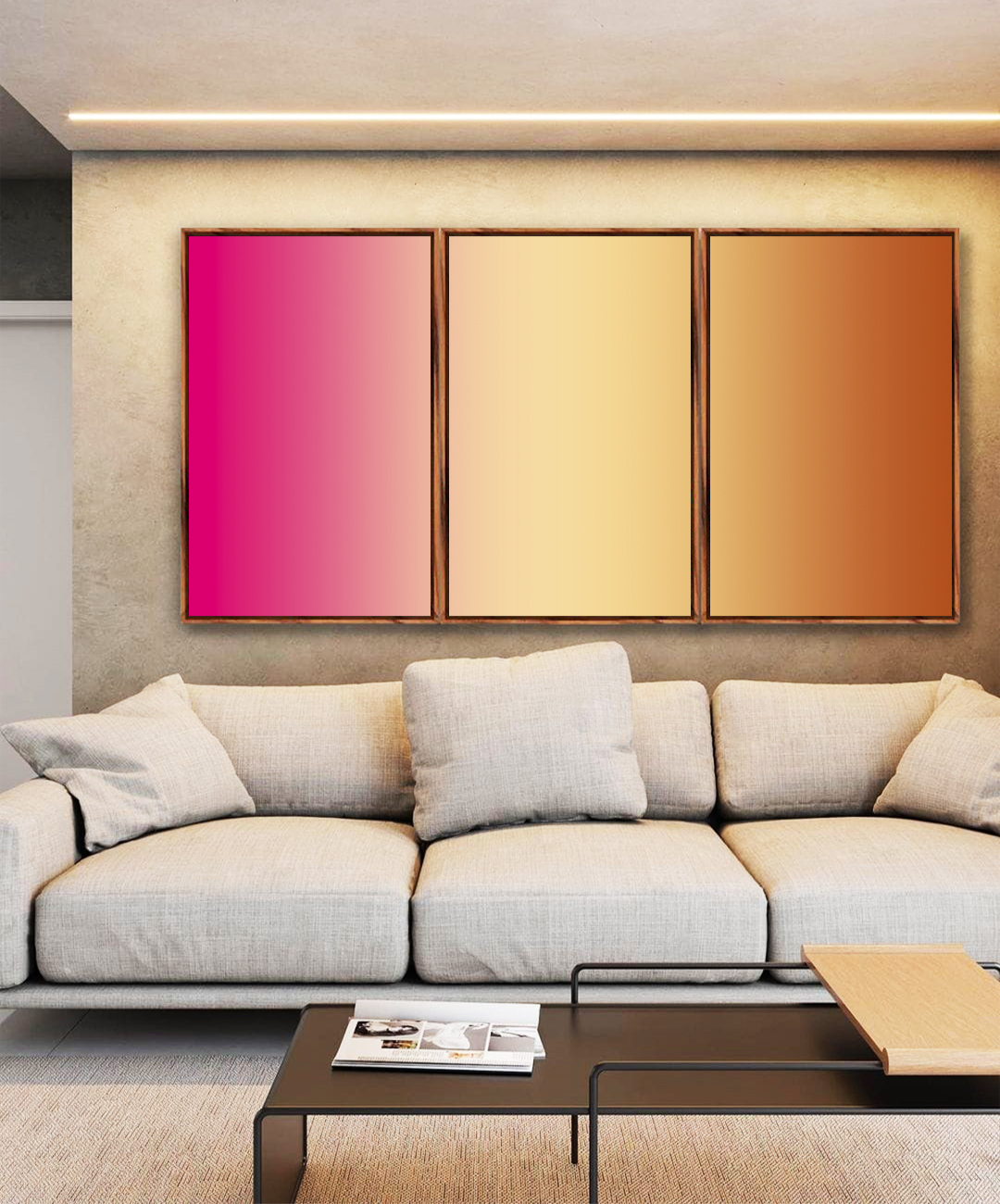 O Trio de Quadros exibe um degradê marcante em rosa choque, bege e caramelo, criando impacto visual moderno. Com moldura elegante, é ideal para compor salas sofisticadas, halls de entrada ou escritórios, tornando o ambiente refinado e aconchegante.