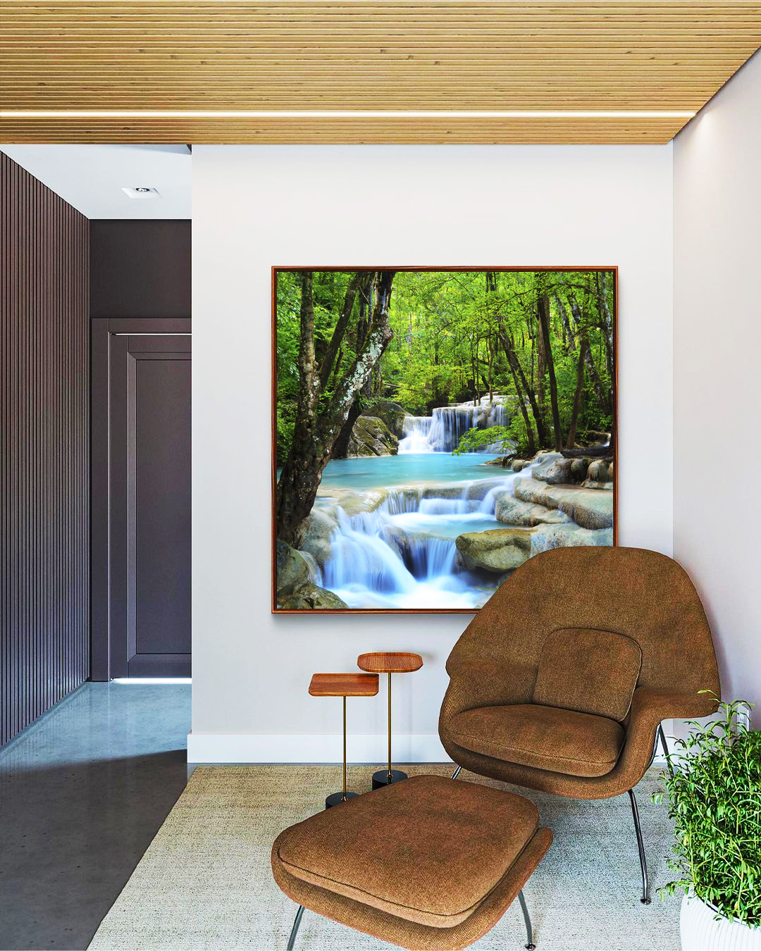 Cachoeira de água azul entre árvores e floresta exuberante, trazendo sensação de frescor, paz e conexão com a natureza. Paisagem natural relaxante, com tons verdes e azuis que iluminam a decoração. Perfeito para salas, quartos ou recepções.