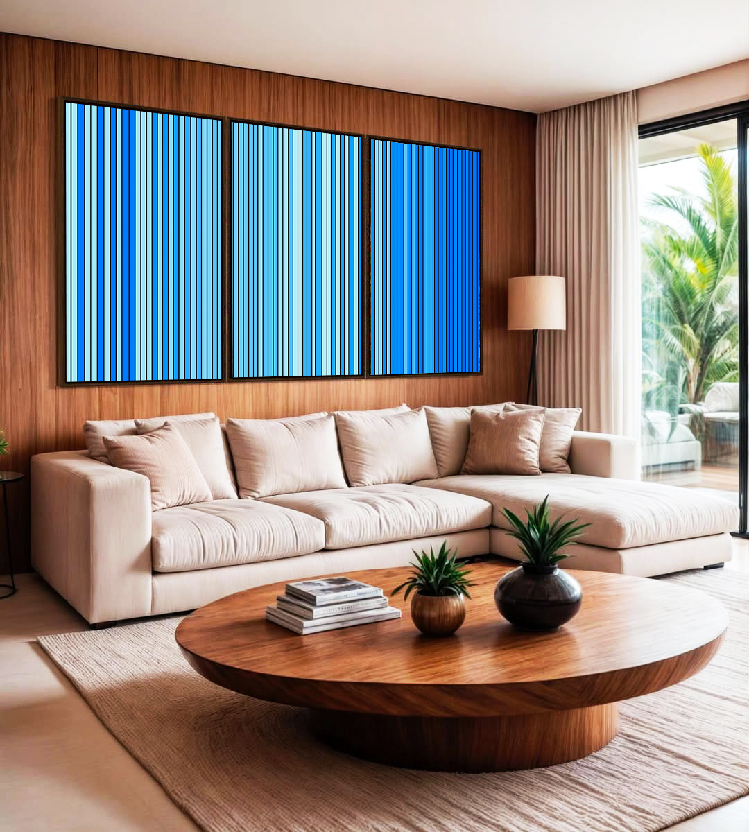 O Trio de Quadros Abstratos em degradê azul bebê e azul royal transmite harmonia e leveza. Moldura Flutuante reforça o estilo elegante. Perfeito para destacar paredes de salas, quartos ou halls de entrada, trazendo requinte e modernidade.