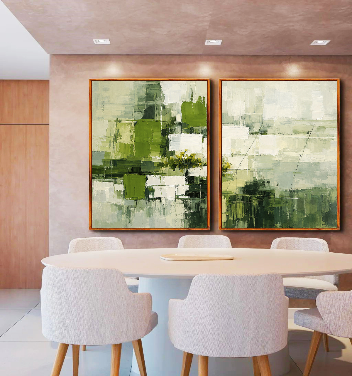 Duo de Quadros Abstrato Verde Cinza Efeito Pintura Canvas Moldura