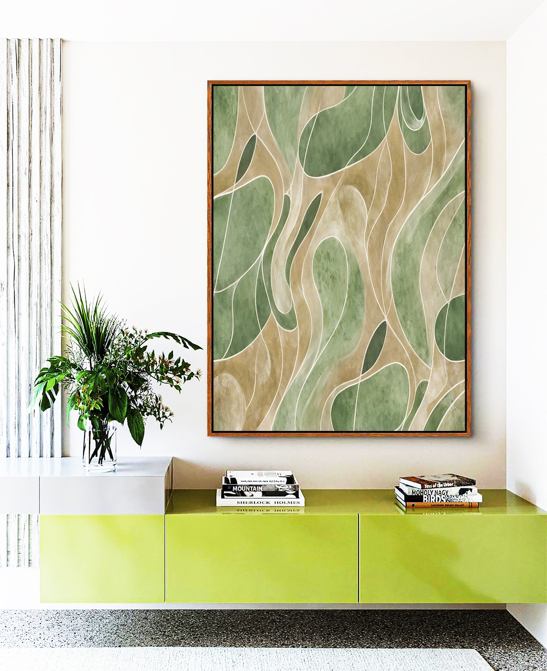 Elegante e sereno, este Quadro Vertical em tons de verde e marfim em contornos suaves cria harmonia visual e sofisticação atemporal no décor. A escolha ideal para salas refinadas, quartos elegantes ou escritórios contemporâneos.