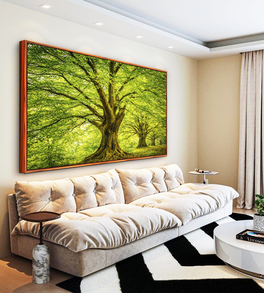 Árvores em meio à natureza iluminada, criando uma atmosfera leve e acolhedora. Ideal para sala, quarto ou espaços que pedem tranquilidade, frescor e conexão com o verde.