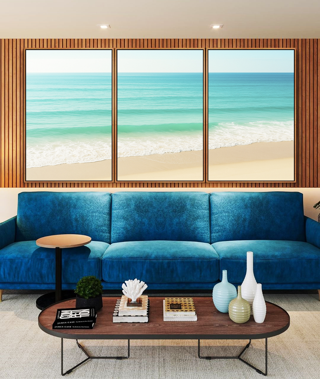 O equilíbrio entre o mar calmo e o céu azul cria uma sensação única de paz. Este Trio de Quadros é perfeito para quem busca elegância e leveza, sendo a escolha certa para realçar salas, escritórios ou quartos com um toque de natureza e sofisticação.