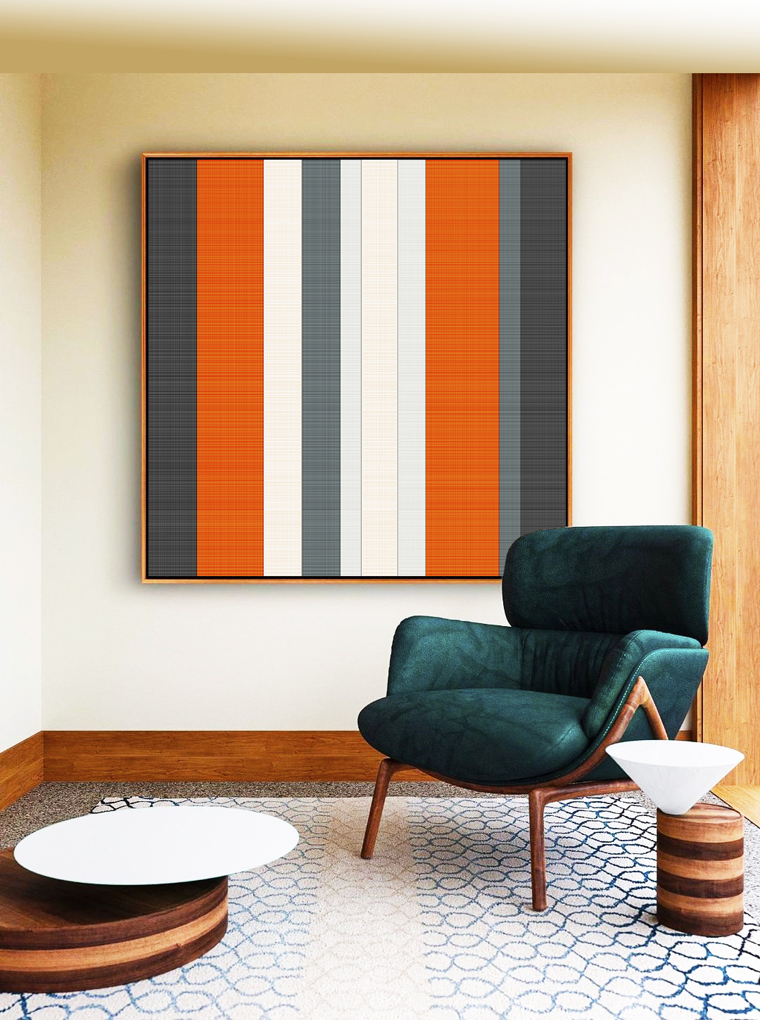 Este Quadro Quadrado abstrato combina listras em laranja, branco e cinza, criando uma composição moderna e sofisticada. A escolha ideal para valorizar salas de estar, quartos elegantes, escritórios contemporâneos bem iluminados.