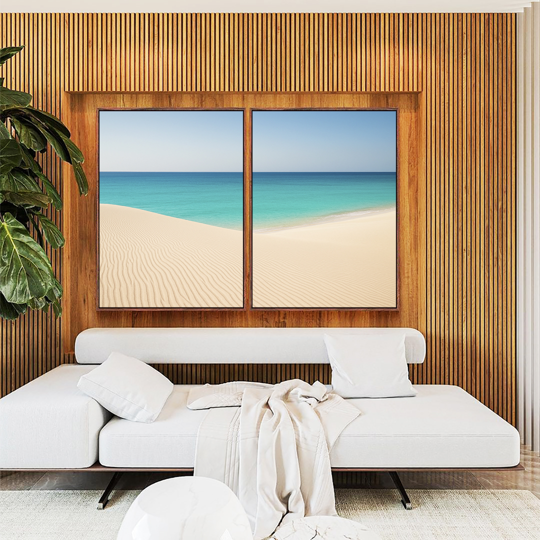 Calmo e sofisticado, este Duo de Quadros com praia clara, céu limpo e mar azul cria uma atmosfera leve e relaxante. A escolha certa para salas modernas, quartos tranquilos, escritórios profissionais ou halls de entrada bem decorados.