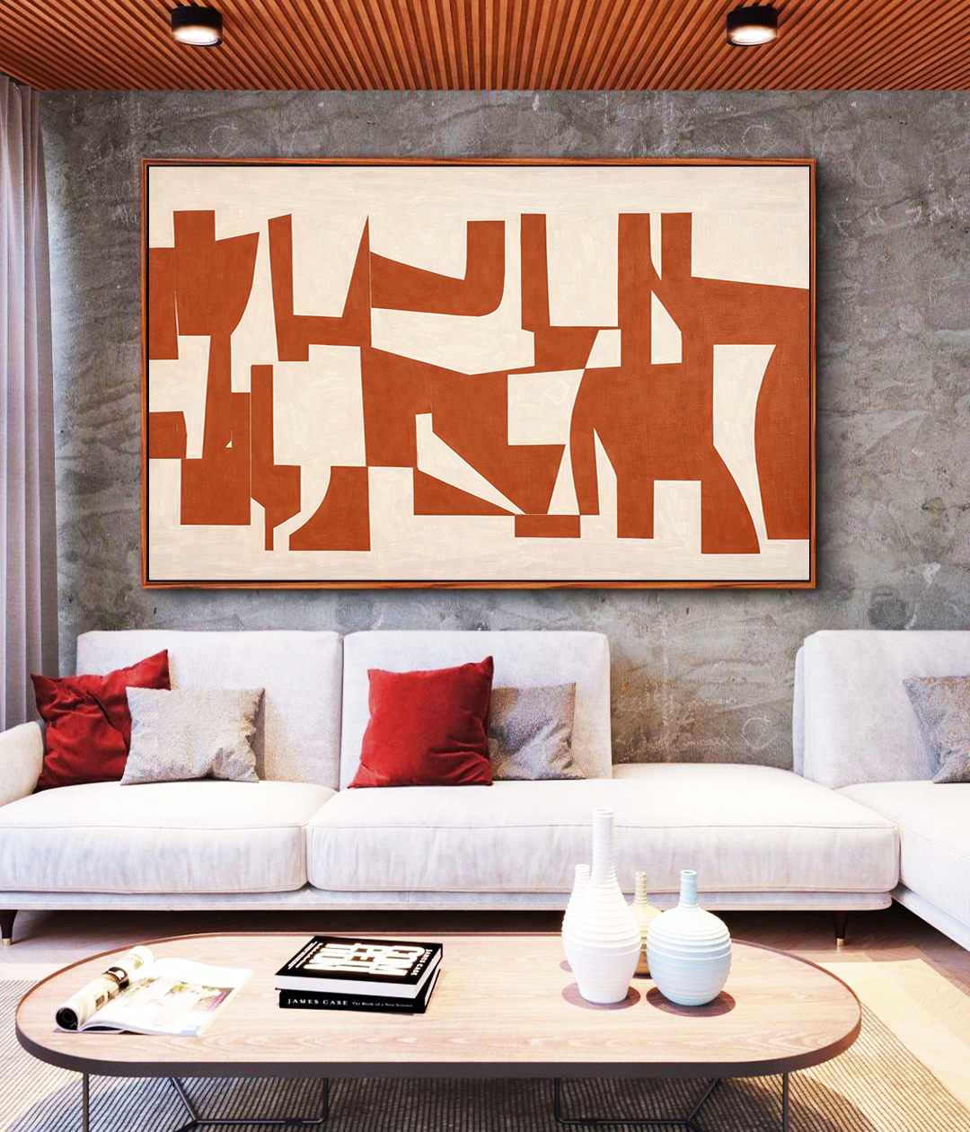 Linhas geométricas minimalistas em tons de laranja e marfim criam um ambiente harmonioso e atual. Uma escolha versátil para salas, halls, recepções e espaços que valorizam design e conforto.