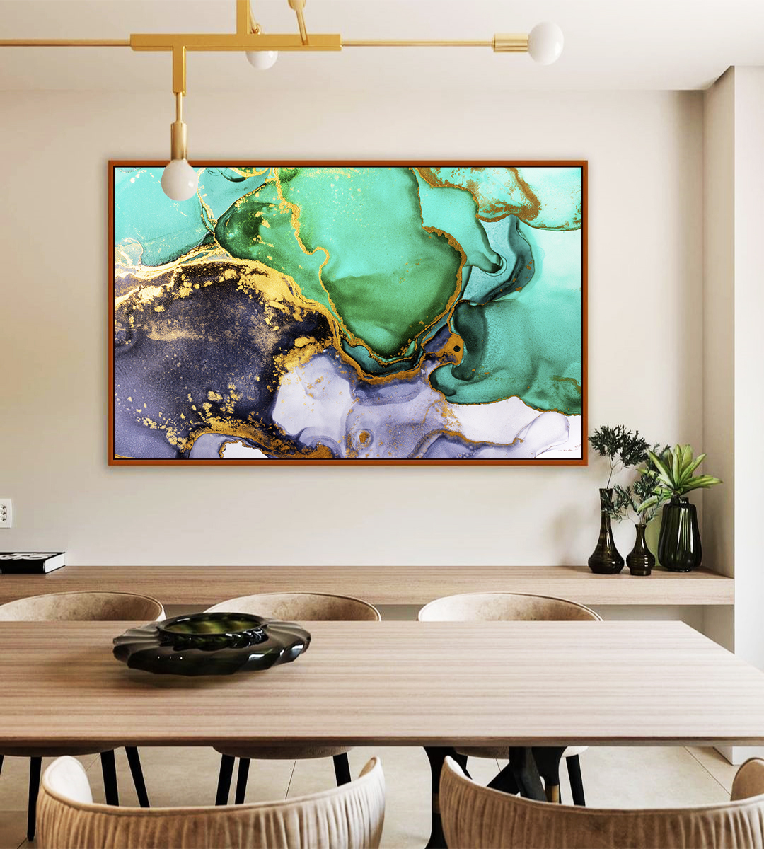 A fusão do verde turquesa, dourado e cinza cria um efeito fluido hipnotizante neste Quadro Horizontal. Uma escolha sofisticada para quem deseja adicionar elegância e leveza à sala, quarto ou escritório. Moderno e Impactante!