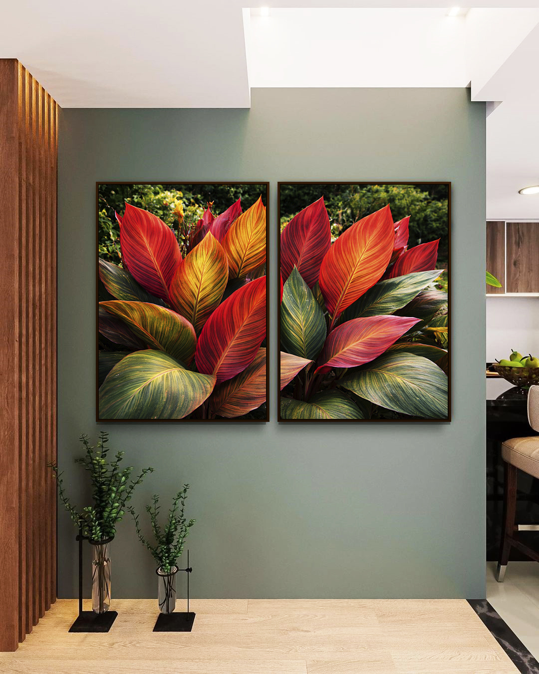 Folhagem tropical de cróton com folhas vibrantes em tons de vermelho, amarelo, laranja e verde. Natureza exuberante que traz energia, cor e frescor à decoração. Destaque visual para salas, escritórios e ambientes contemporâneos.