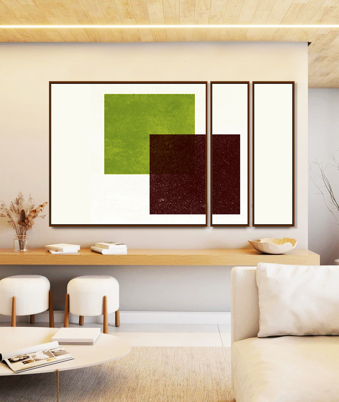A harmonia entre o verde e o vinho cria um contraste sofisticado neste Trio de Quadros Estilizados. É a escolha certa para quem busca modernidade e estilo em salas, quartos ou escritórios com design contemporâneo.