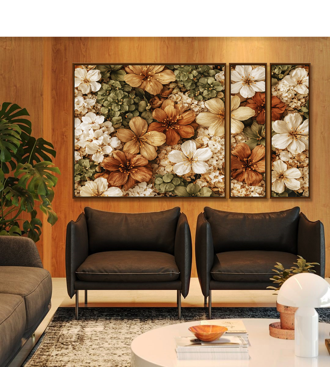 Flores silvestres em cores neutras criam uma atmosfera acolhedora e natural, trazendo leveza e equilíbrio ao espaço. Ideal para salas, quartos e ambientes que buscam conexão com a natureza e elegância discreta.