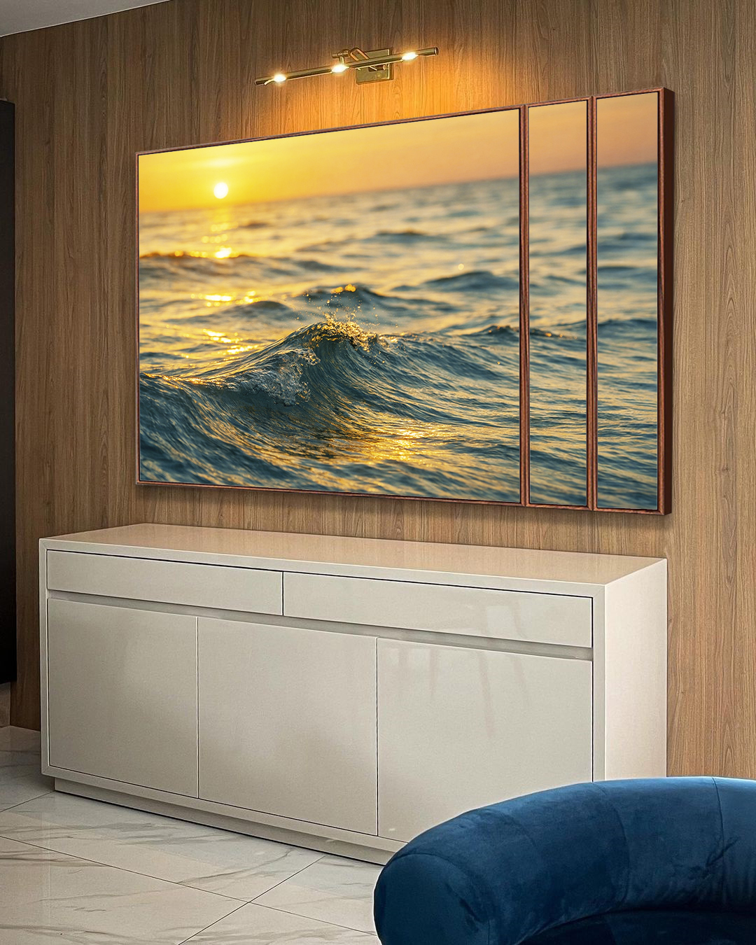 Pôr do sol sobre o mar com ondas suaves e brilho prateado que transmite paz e elegância. Ideal para sala de estar, quarto, escritório, consultório ou casa de praia. Perfeito para decoração litorânea, estilo contemporâneo e ambientes relaxantes.