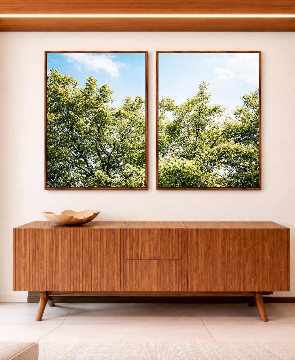 Duo de Quadros Árvores Folhagem Verde Céu Claro Nuvens Natureza Paisagem Canvas Moldura