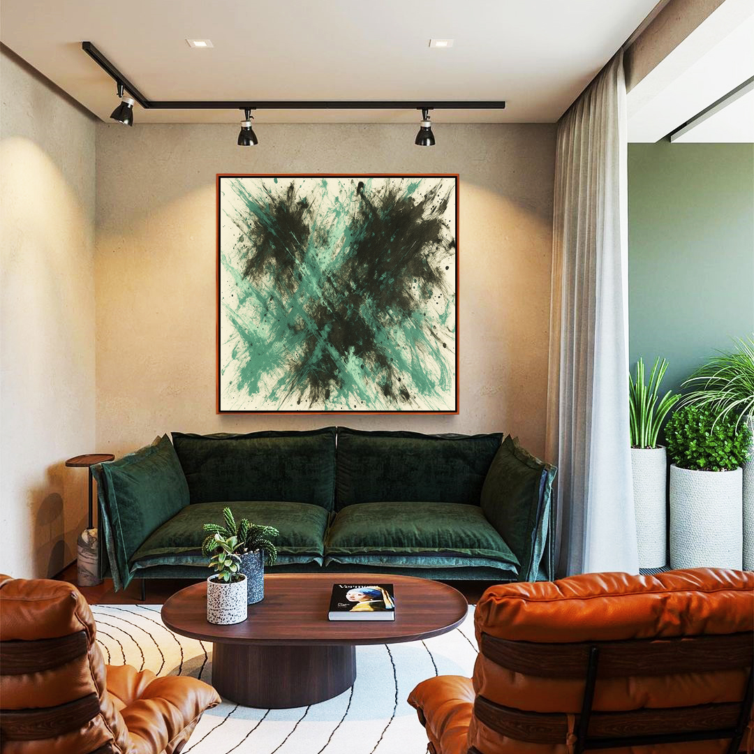 Moderno e versátil, este Quadro Quadrado em tons verde menta e cinza chumbo cria impacto visual refinado. Sua moldura flutuante traz leveza e elegância. Ideal para transformar salas de estar, quartos, escritórios ou halls sofisticados.