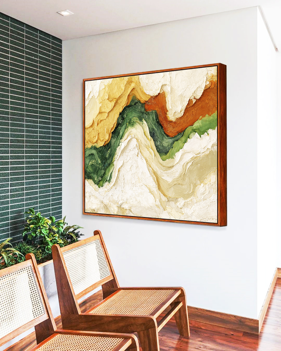 Arte abstrata com ondas em amarelo, verde e laranja que lembram pinceladas fluidas e cheias de energia. Ideal para salas de estar, quartos, escritórios ou recepções. Cores vibrantes que destacam decoração moderna, artística e cheia de personalidade.