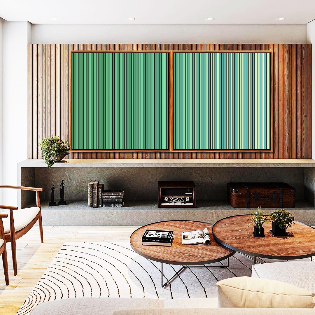 Com listras e degradê em verde turquesa, este Duo de Quadros Quadrados transmite equilíbrio, movimento e estilo. Ideal para salas amplas, quartos sofisticados ou halls de entrada que pedem um toque contemporâneo marcante e cheio de elegância visual.
