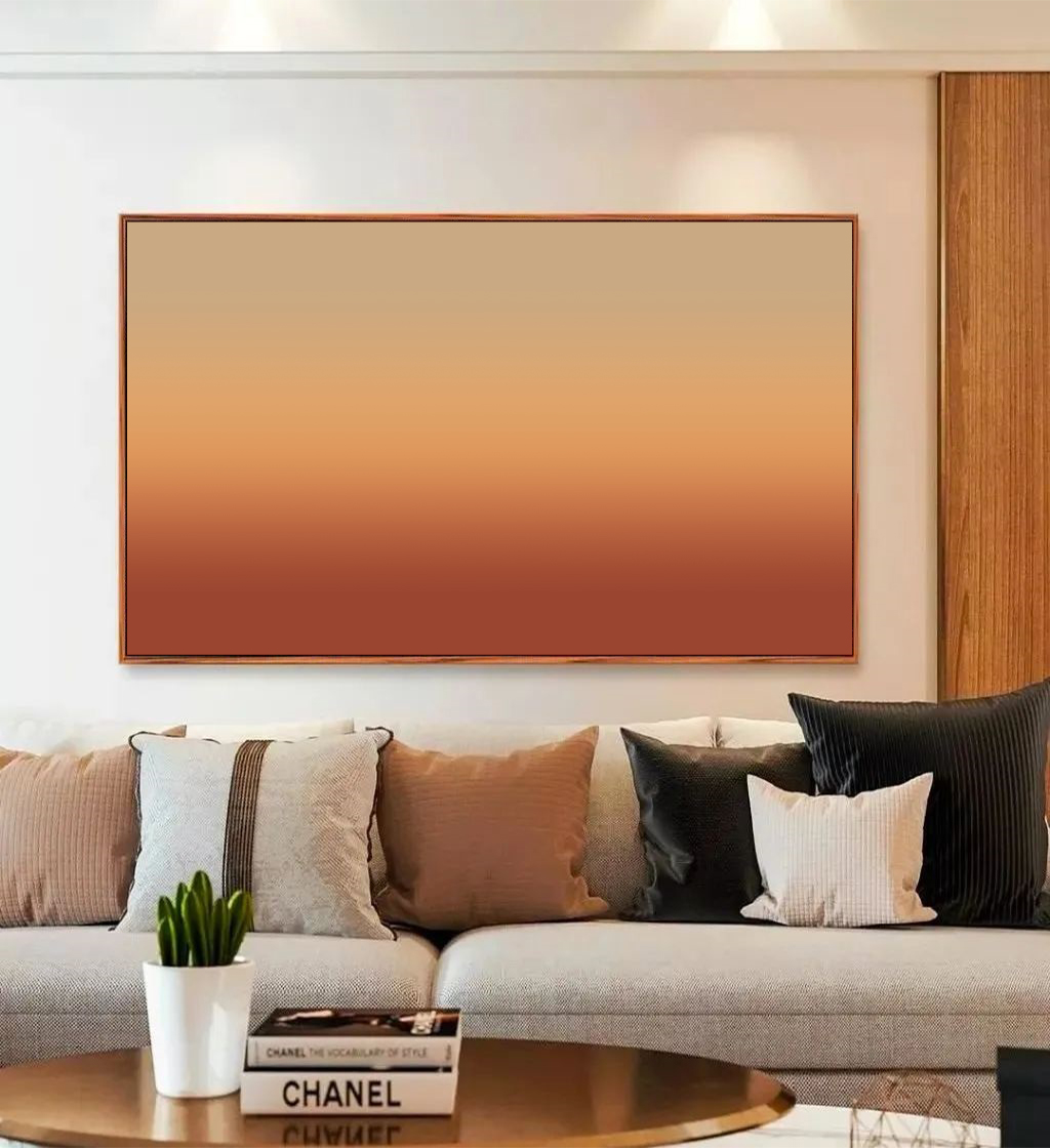 Degradê abstrato em tons de areia, cobre e terracota, trazendo leveza visual, calor e sofisticação ao ambiente. Estilo moderno com paleta terrosa que valoriza decorações elegantes e acolhedoras.
