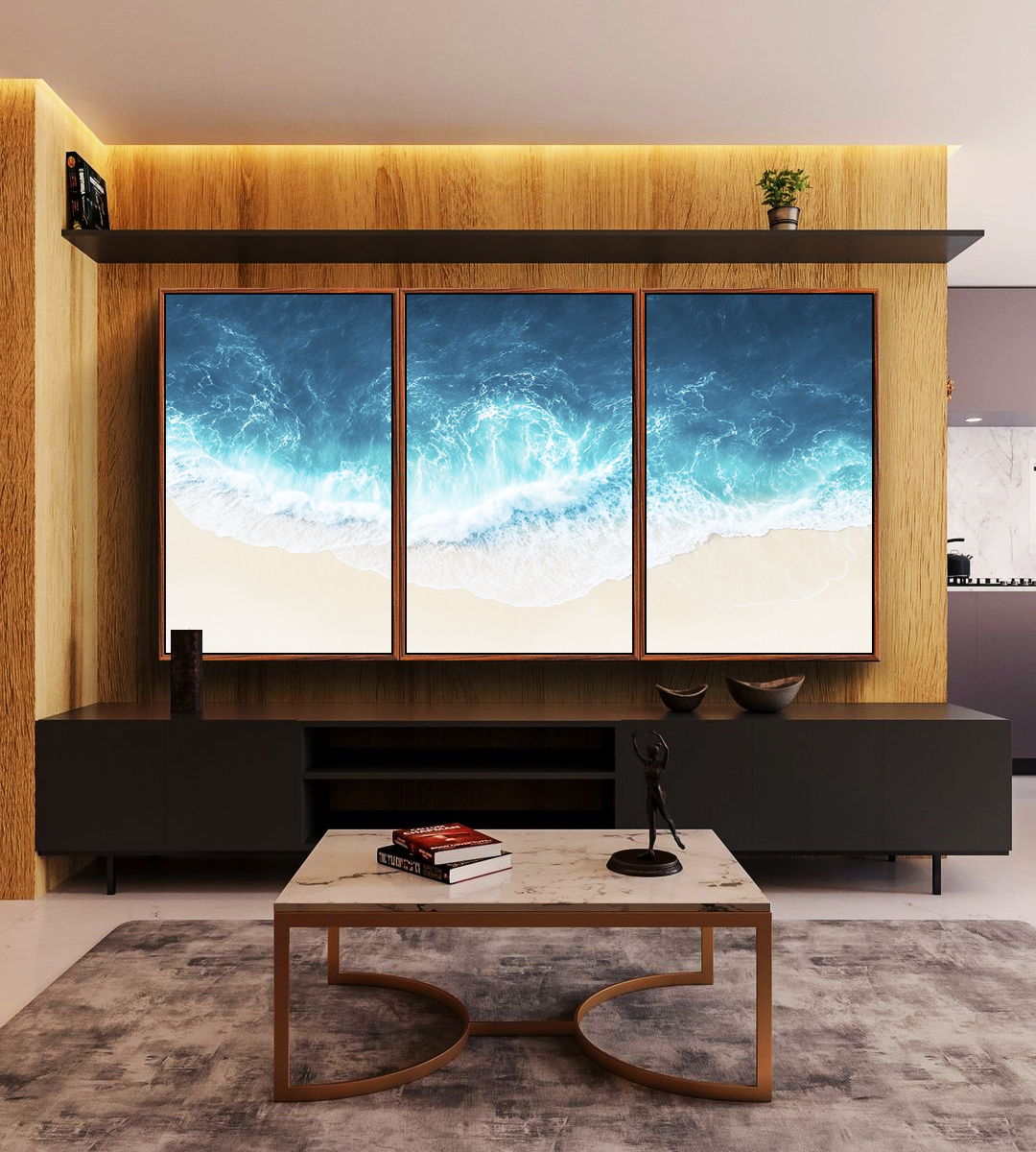 A beleza serena do mar azul intenso reflete neste Trio de Quadros, que une natureza e elegância em perfeita harmonia.