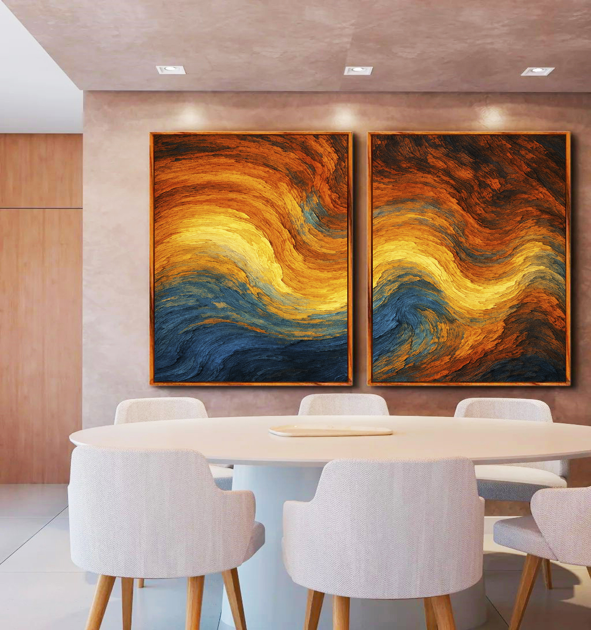 Arte abstrata com ondulações em laranja, amarelo e azul, trazendo energia, calor e movimento visual. Ideal para quartos, salas modernas, escritórios ou hall de entrada criando ambiente contemporâneo, vibrante e sofisticado.