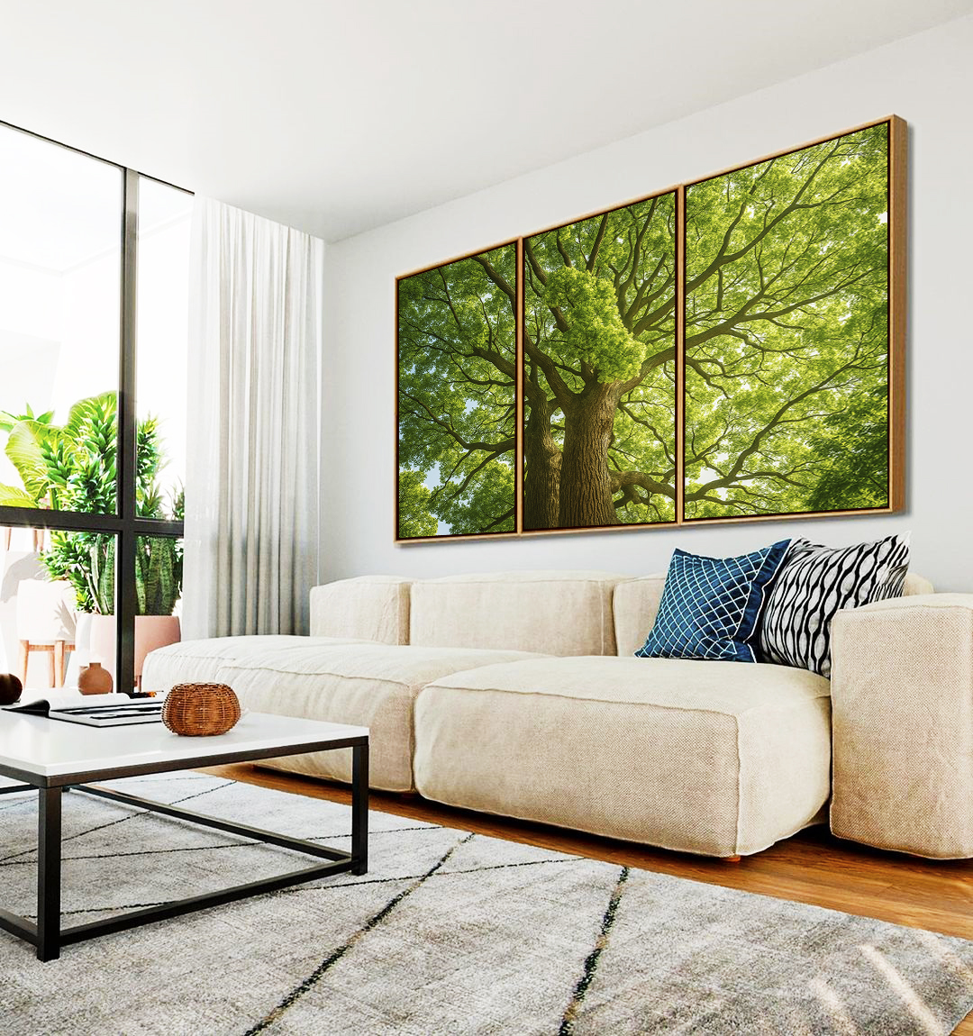 A paisagem natural com árvores e tons de verde traz sensação de calma e harmonia ao espaço. Este Trio de Quadros é a escolha certa para salas de estar, quartos ou escritórios, valorizando a decoração com elegância e bem-estar.