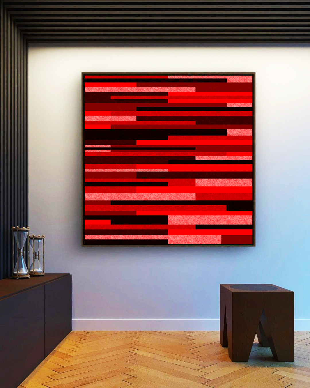 O mosaico geométrico em vermelho vinho e preto cria um abstrato elegante e expressivo. Este Quadro Quadrado é a escolha ideal para salas, quartos ou escritórios, adicionando profundidade, contraste e um visual contemporâneo à decoração.