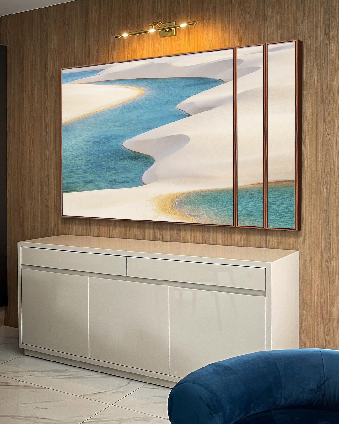Dunas de areia branca e mar azul claro que trazem leveza e tranquilidade ao ambiente. Perfeito para sala, quarto ou espaços de descanso com uma sensação fresca e natural. Leve e Encantador!