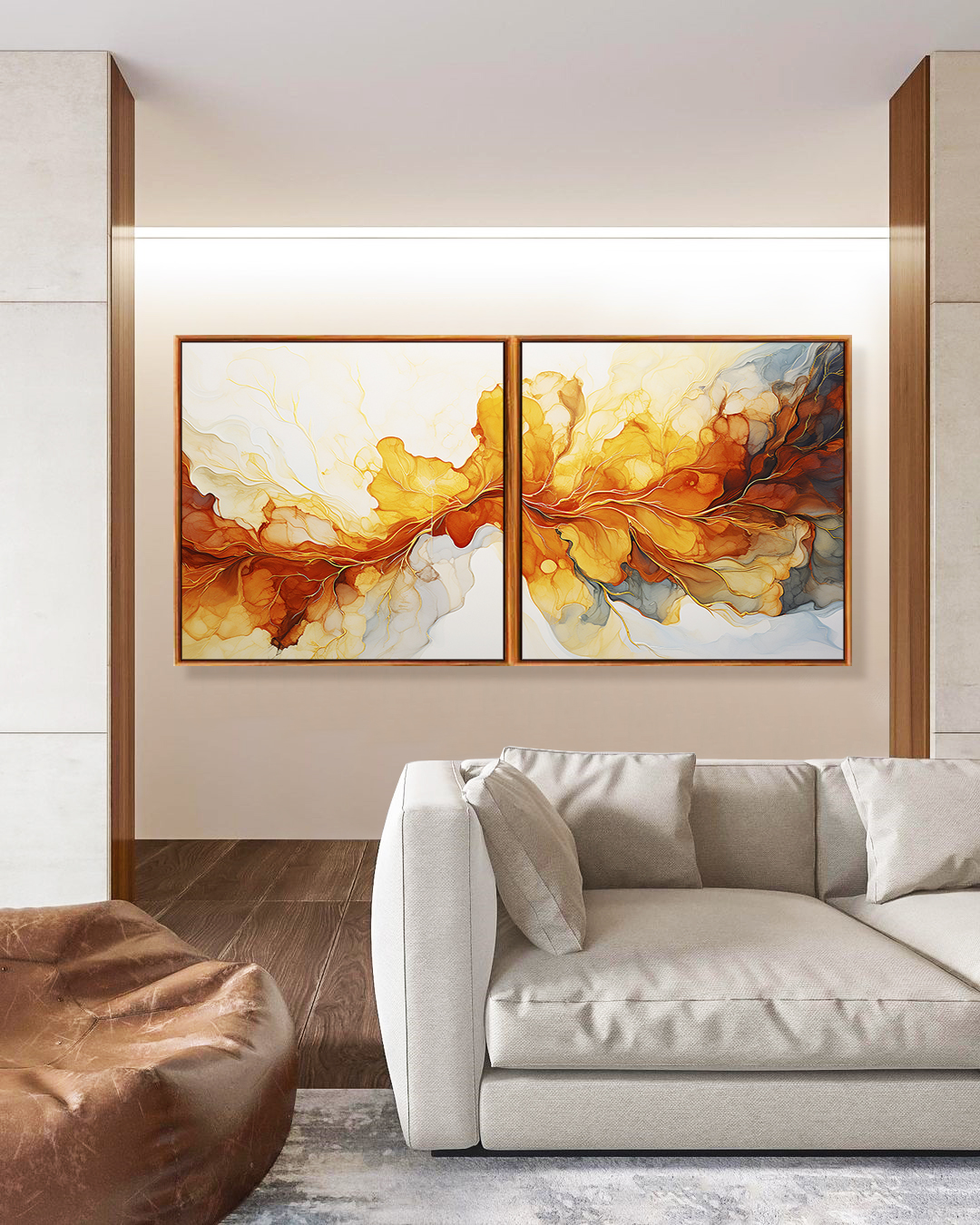 O Duo de Quadros Quadrados em arte pouring revela fluidez e contraste entre o cinza, dourado e o amarelo. Uma combinação que transmite sofisticação a quartos modernos, salas elegantes ou halls bem decorados. Moldura flutuante acompanha o conjunto.