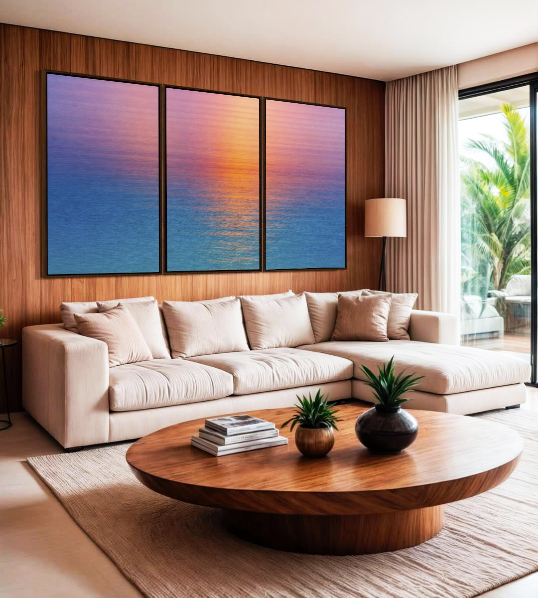 Delicado e marcante, este Trio de Quadros de natureza com mar azul e céu rosa ao pôr do sol cria ponto focal elegante. Ideal para compor salas sofisticadas, quartos estilosos, escritórios modernos ou halls de entrada de destaque.