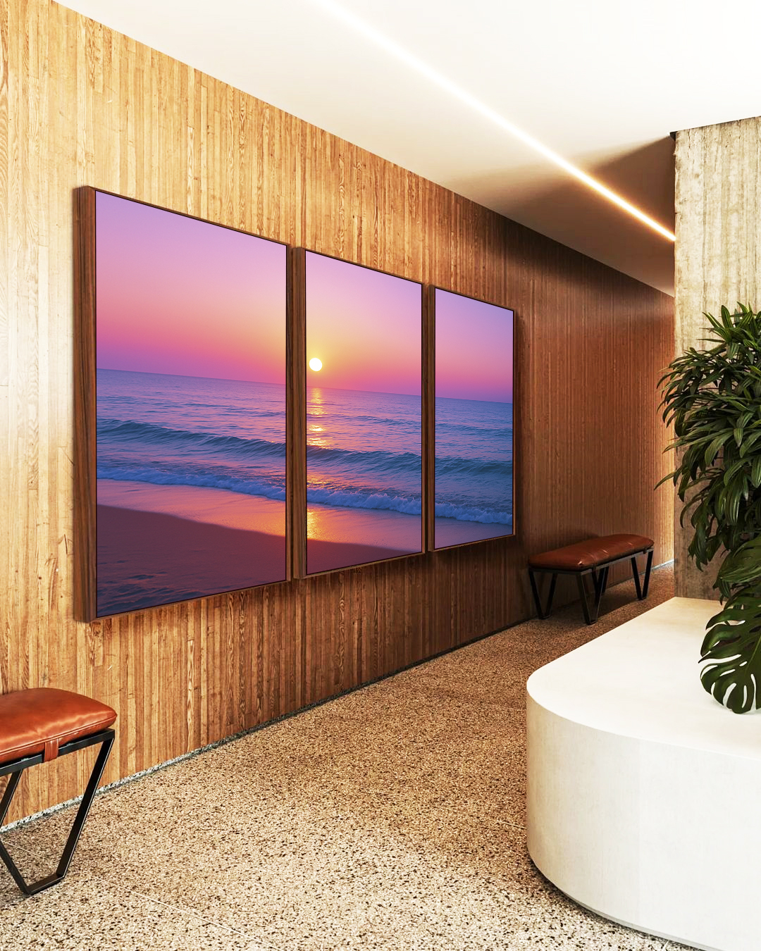 A delicadeza do pôr do sol em rosa e lilás sobre o mar calmo cria uma atmosfera de paz e beleza. Este Trio de Quadros é perfeito para transformar salas, quartos ou escritórios em espaços acolhedores e visualmente inspiradores.