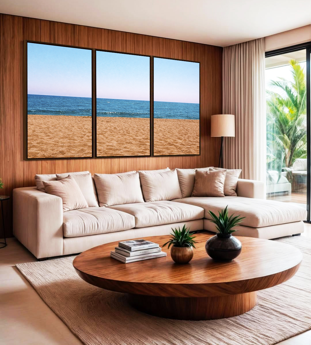 Praia e sereno, este Trio de Quadros com areia, mar azul e céu claro transmite frescor e tranquilidade visual, criando atmosfera sofisticada. Perfeito para iluminar salas elegantes, quartos refinados ou halls de entrada acolhedores.