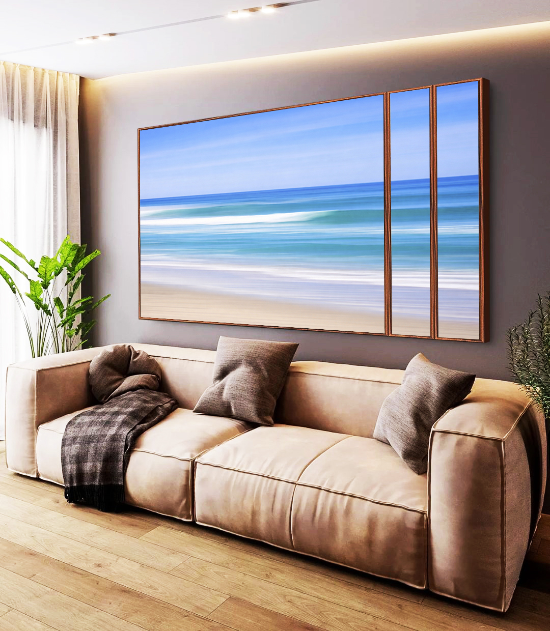 O encontro do mar azul com o céu claro cria uma atmosfera leve e serena, transmitindo movimento e tranquilidade. A escolha ideal para salas sofisticadas, quartos acolhedores, escritórios elegantes ou halls de entrada que pedem frescor.