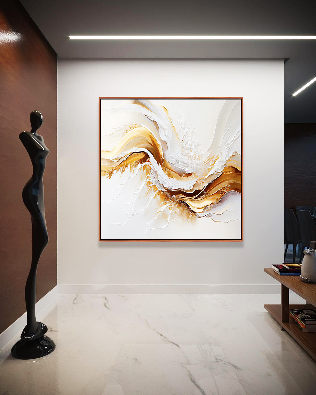 Um toque de sofisticação em formato Quadrado. Arte fluida branco e dourado, ideal para salas amplas, escritórios ou halls modernos. Moldura extra fina flutuante que valoriza os detalhes da composição abstrata. Além de Lindo é um Quadro Elegante!